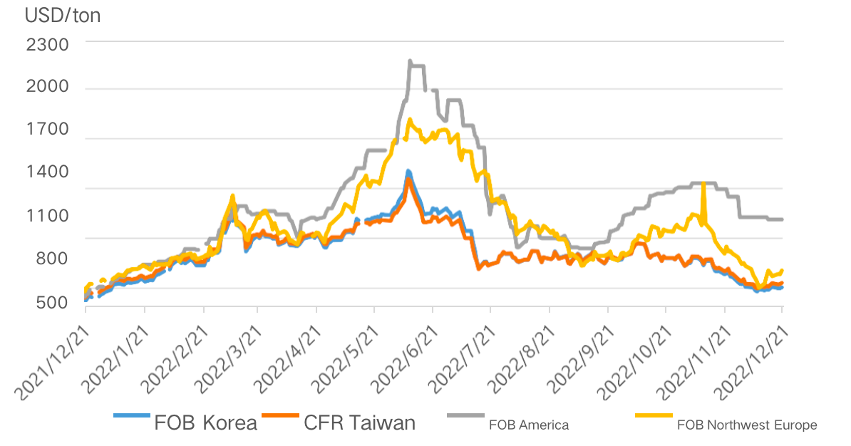 Types de | FOB Corée | CFR Taïwan, Chine | FOB Etats-Unis | CAF L'Europe |