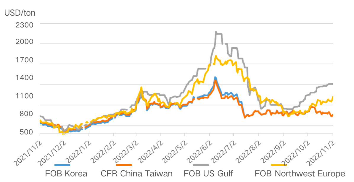taper | FOB Corée | CFR Chine | FOB Etats-Unis | FOB L'Europe |
